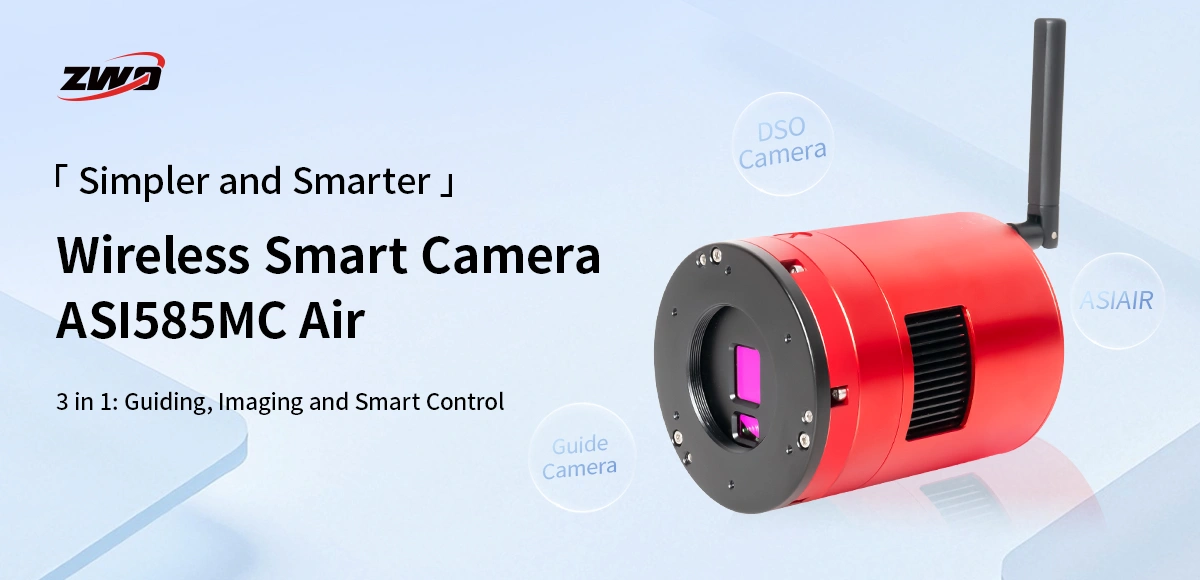 New ZWO 585MC Air Camera Excellent Choice For Simplicity In Astrophotography. It Offers Budge Solution For All In 1 Sytem Of Cooled Camera, Guide Camera And ASIAir Function Thus Reduce Need For Multiple Equipment