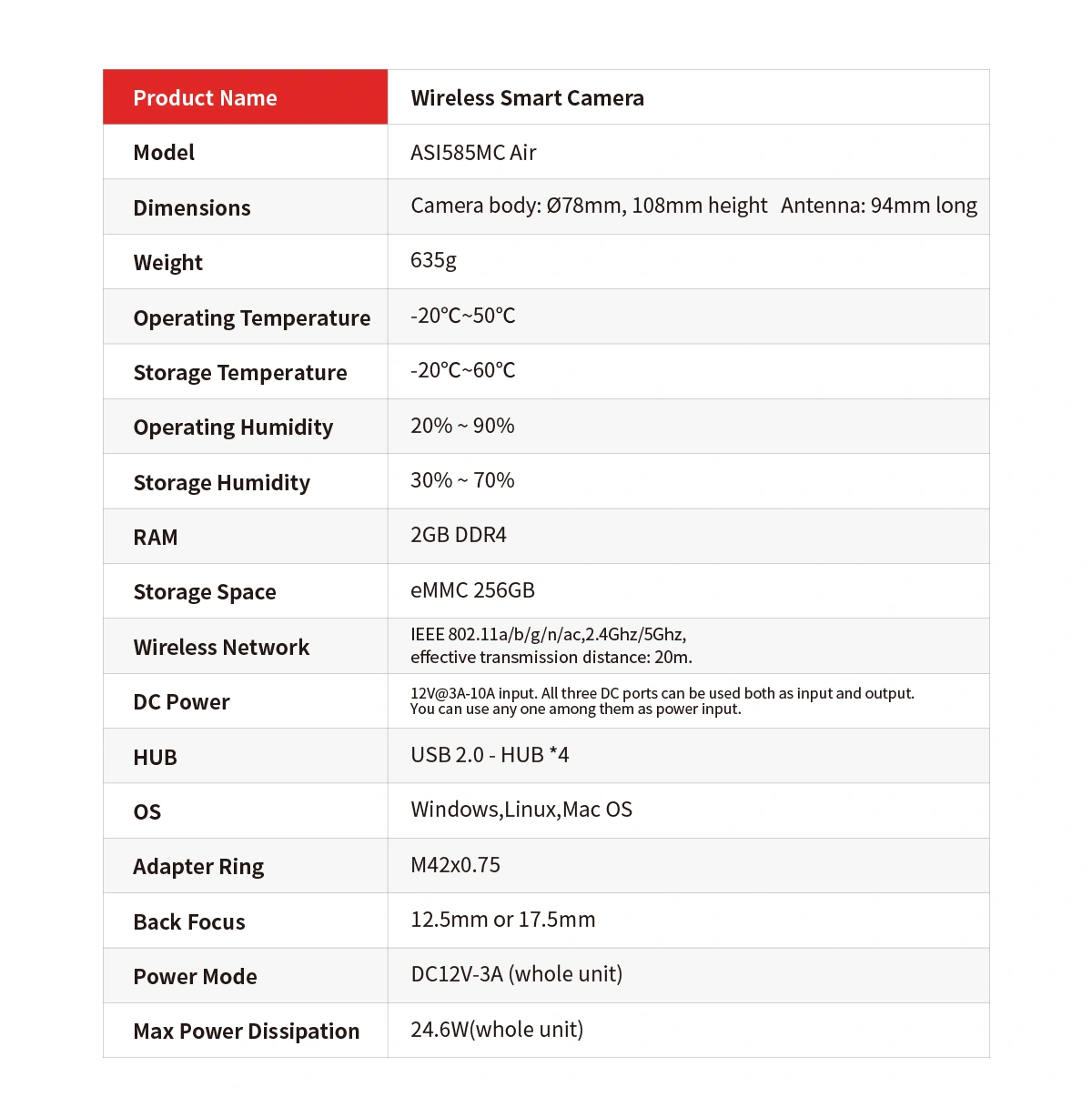 The ASI585MC Air incorporates multiple ZWO patented technologies and allows you to shoot simply by connecting your phone. It supports App OTA updates, continuously improving the product features, making astrophotography easy and fun, while enriching the user experience.