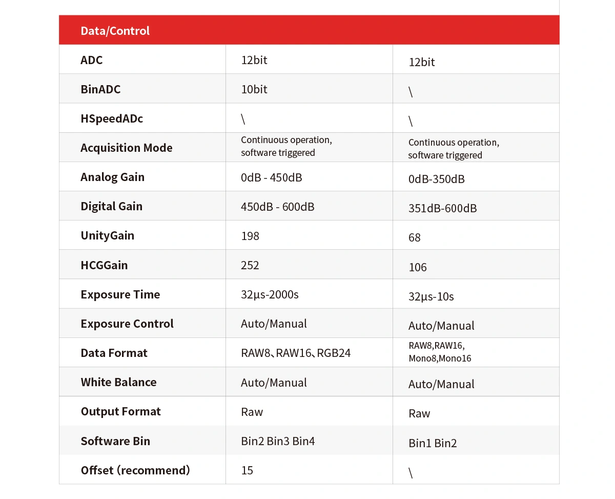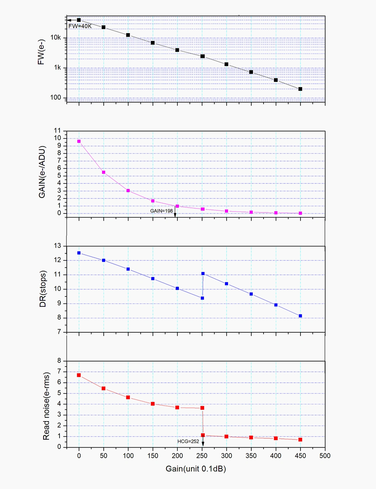 The camera has a built-in HCG mode, which can effectively reduce readoutnoise at high gain and allow the camera to maintain the same high dynamicrange as it does at low gain. When the gain is 252, the HCG mode isautomatically turned on and the Dynamic range reaches a level close to 12bit.The readout noise is as low as 0.7e.