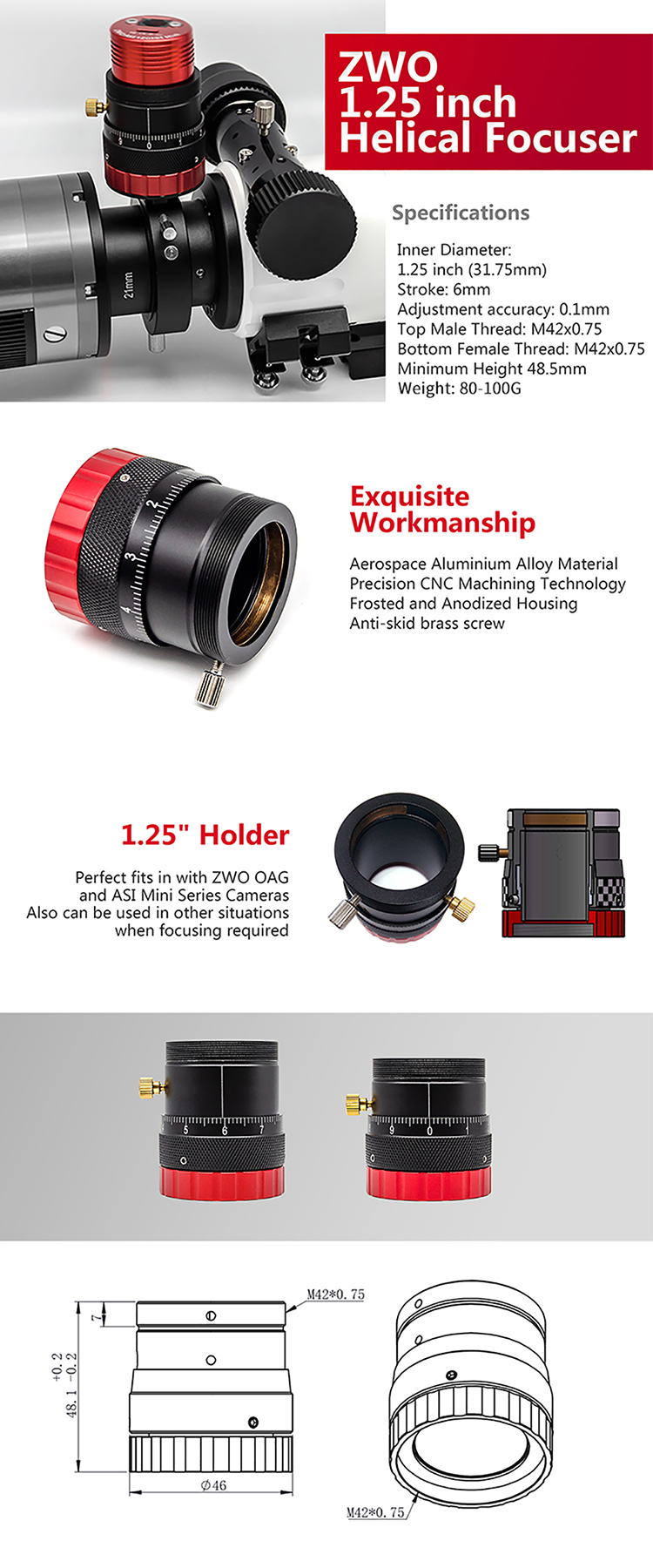 Fitting of M42x0.75 threading on either side, you can be sure in knowing how easily this focuser can be adapted into your setup. The adjustment accuracy of 0.1mm is also sure to impress any veteran astronomer
