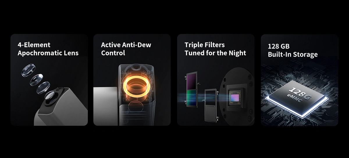 Engineered to minimize chromatic aberration, the 4-element apochromatic lens (with an Extra-low Dispersion glass) delivers rounder, sharper stars and clean, neutral blacks.