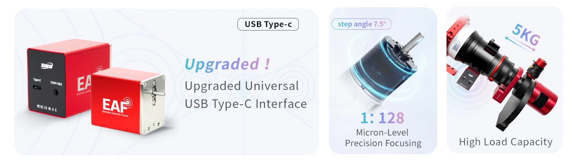 The ZWO EAF integrates a high-precision custom stepper motor with compact yet powerful performance. Featuring a 1:128 reduction ratio, it provides the motor with strong torque and precise control capabilities, achieving micron-level positioning accuracy. Each rotation responds precisely to commands, ensuring accurate and reliable focusing.
