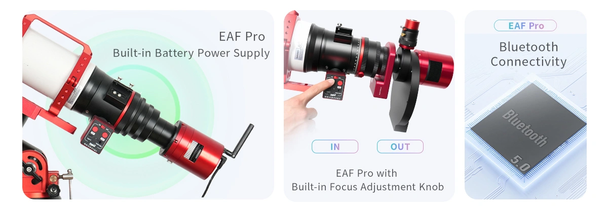 EAF Pro comes with a built-in battery and Bluetooth connectivity, reducing power supply constraints. It also includes manual focus buttons, allowing direct adjustment even after installation — offering maximum flexibility and convenience. Both models deliver a more user-friendly focusing experience, achieving pinpoint focusing accuracy for breathtaking cosmic imagery.