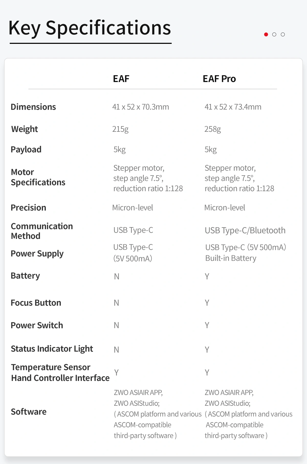 The new generation of ZWO EAF continues the brand’s signature minimalist design, featuring a robust metal housing and precise angular lines — a perfect fusion of form and function. Available in two versions: EAF and EAF Pro — to suit different user needs.