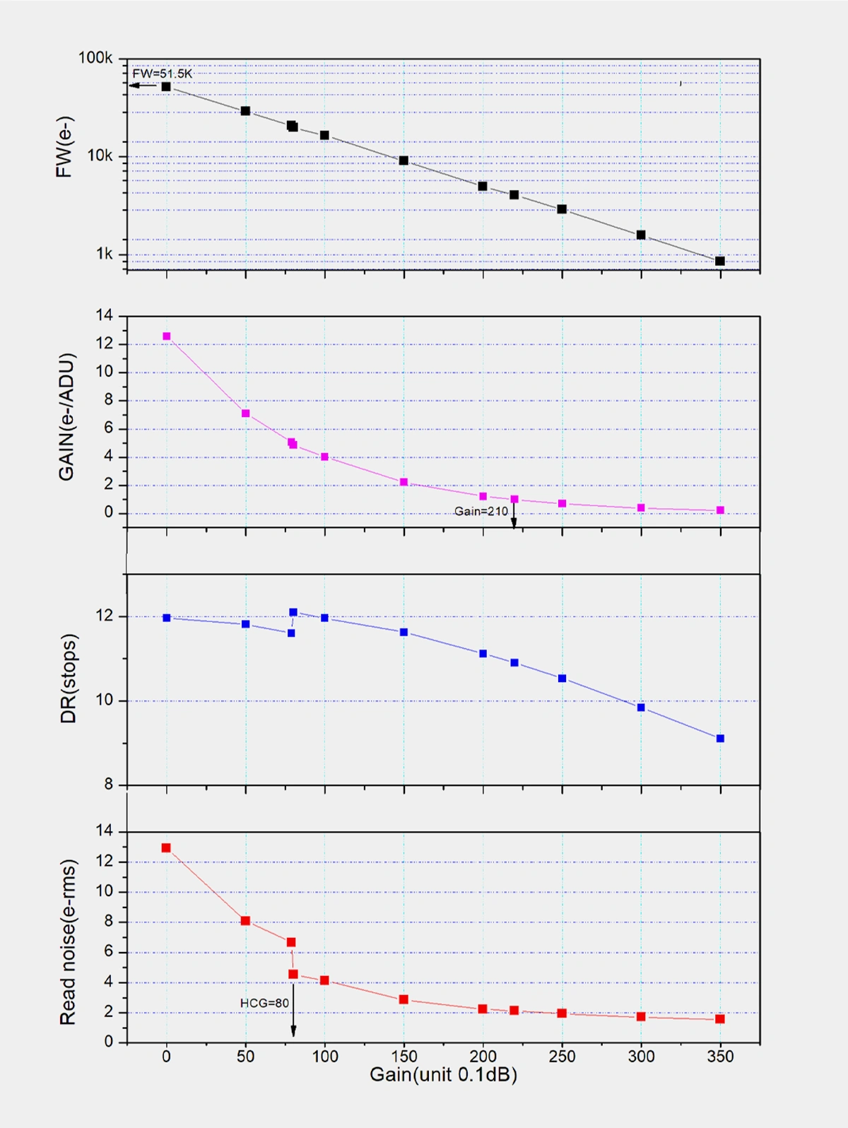 ASI482MC has a built-in HCG mode which can effectively reduce the readout noise at high gain and keep the same wide dynamic range as you would expect at low gain. When the gain is 80, the HCG mode will automatically turn on. The read-out noise falls off a cliff while the dynamic range still can reach close to 12 stops. The minimum read noise is 1.5 e.