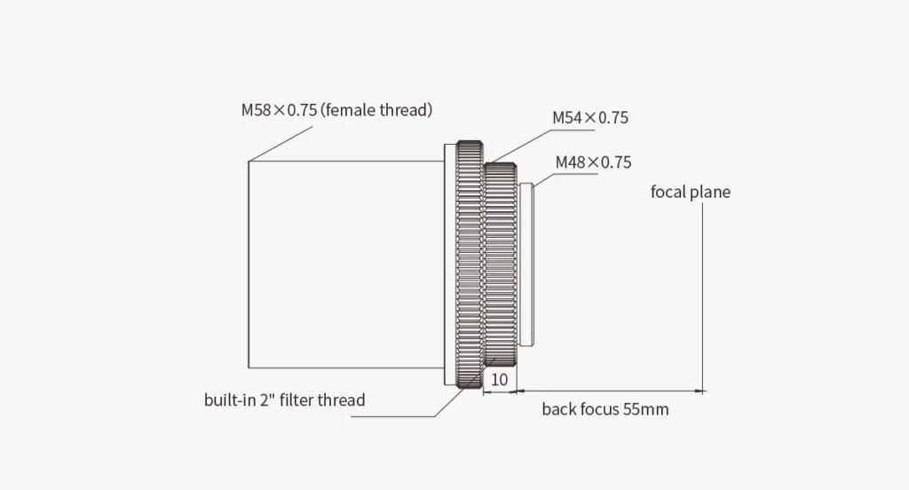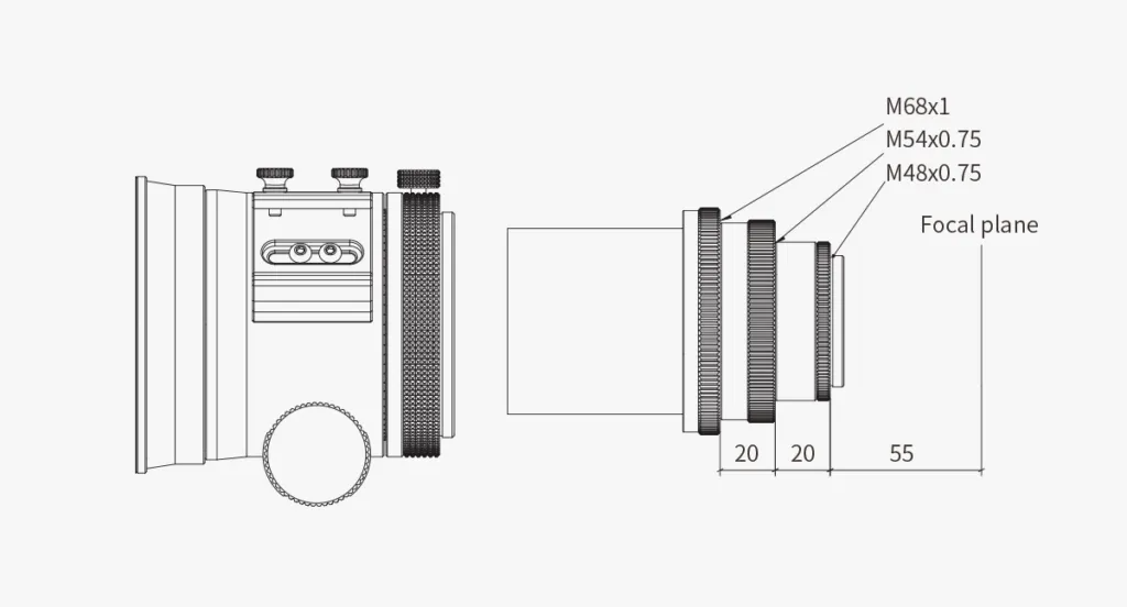 The reducer has a rear interface that attaches to the FF80APO telescope tube’s included four-segment camera extension tube. The back focus is the standard 55mm, and it has a built-in M48X0.75 2-inch filter thread for easy attachment.