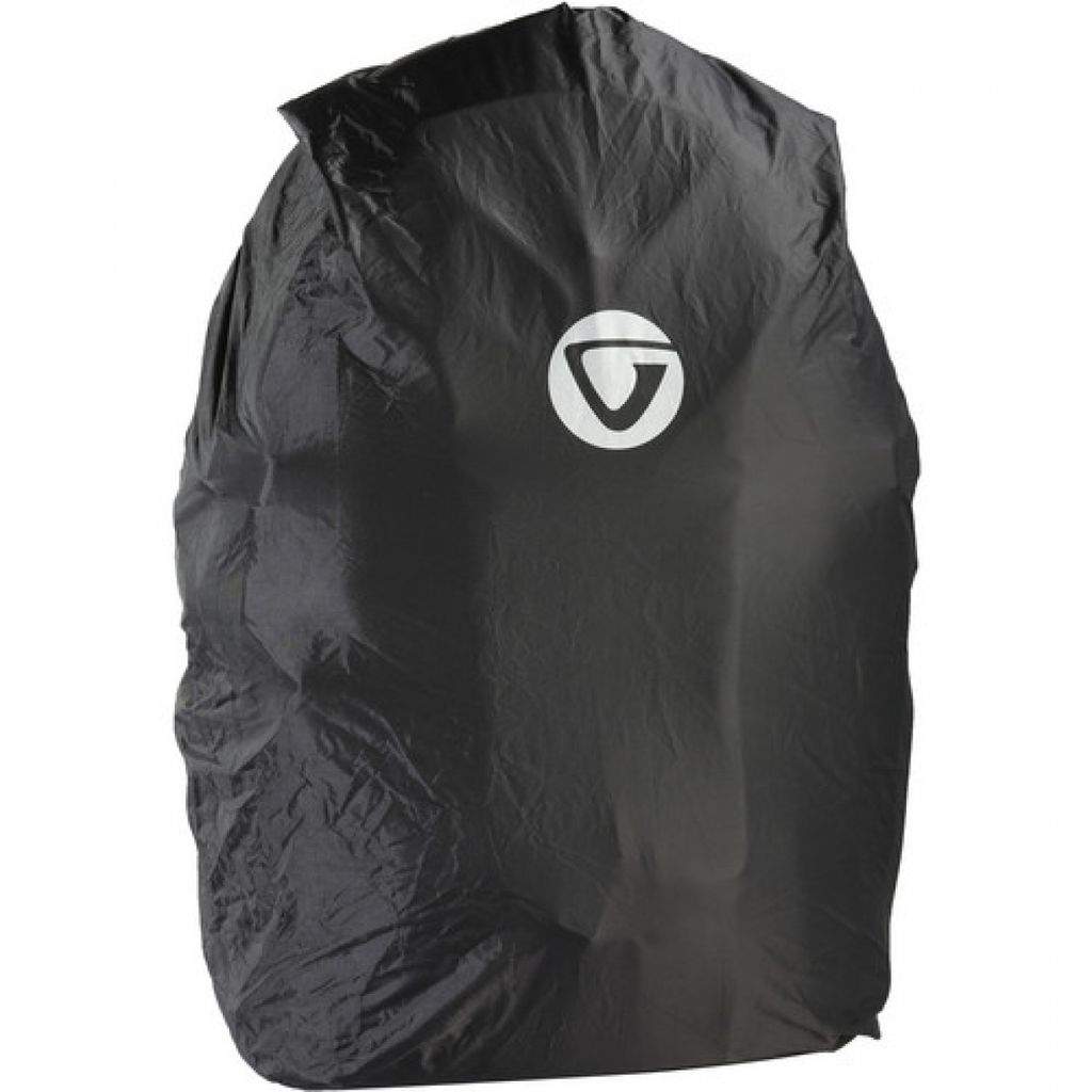 The black Up-Rise II 46 Photo Backpack from Vanguard holds a DSLR with a grip, an attached 70-200 f/2.8 lens, four additional lenses, and a flash between padded, touch-fastened dividers inside the main compartment. It also accommodates a 14" laptop within a dedicated zippered back pocket.