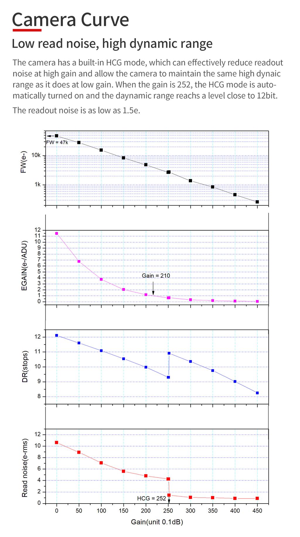 ASI482MC has a built-in HCG mode which can effectively reduce the readout noise at high gain and keep the same wide dynamic range as you would expect at low gain. When the gain is 80, the HCG mode will automatically turn on. The read-out noise falls off a cliff while the dynamic range still can reach close to 12 stops. The minimum read noise is 1.5 e.