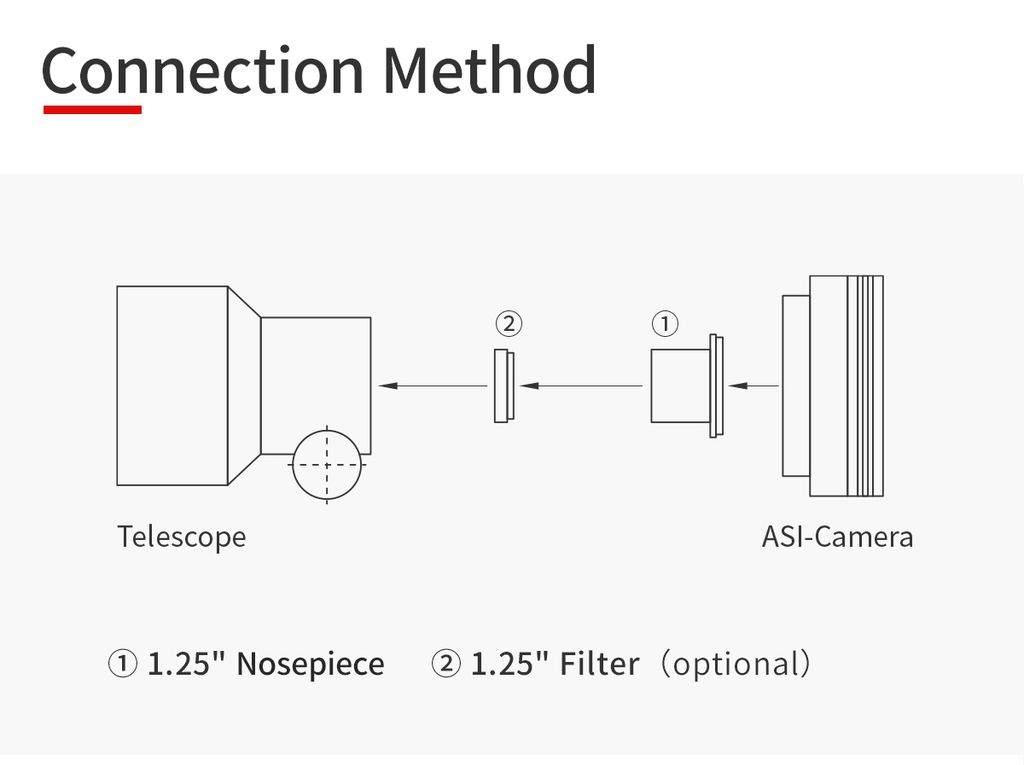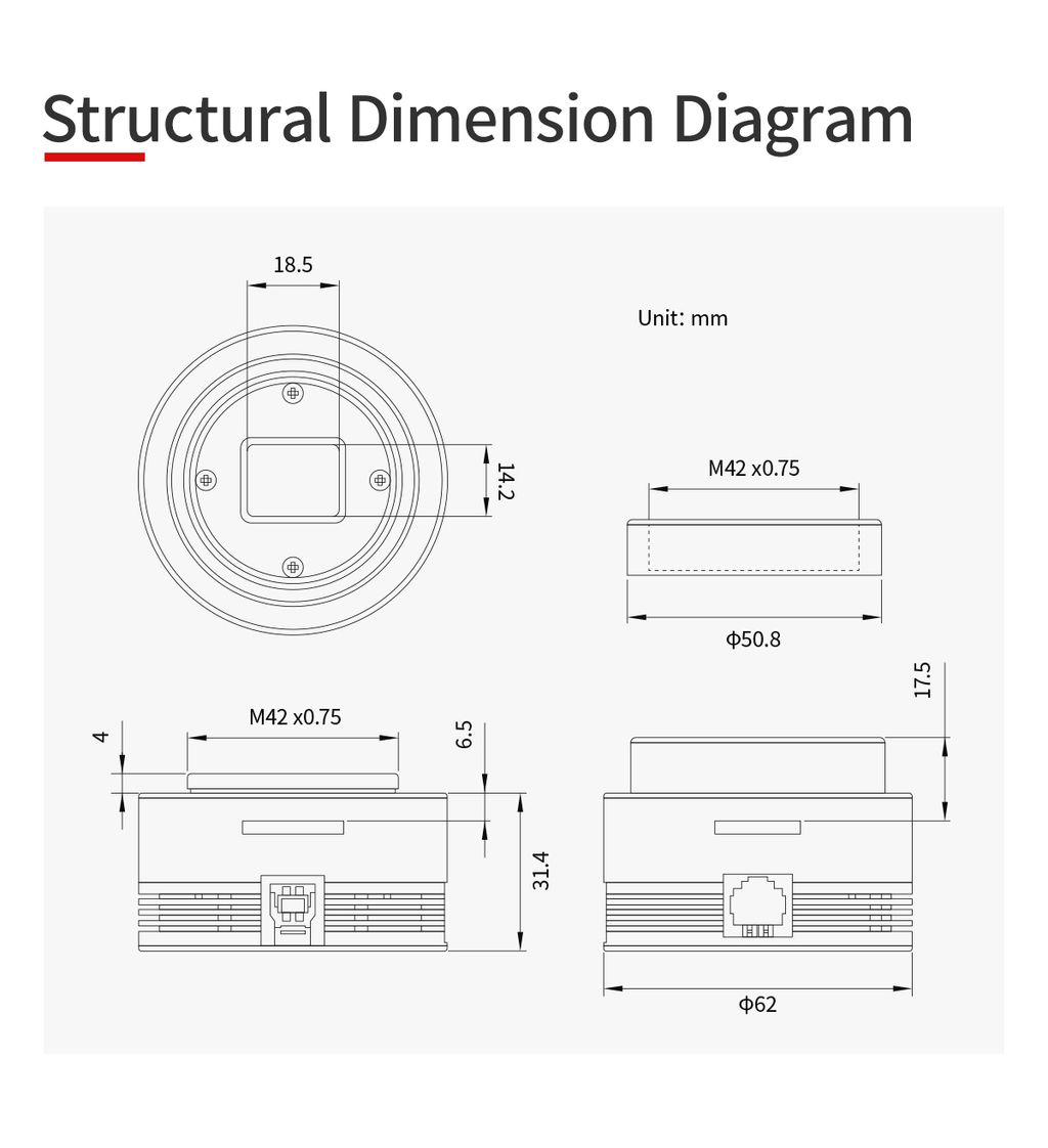 USB 3.0 Port: Like other ASI cameras, the ASI482MC is powered and controlled via USB 3.0. It provides 5Gb bandwidth to let the camera run at 82.5fps (10bit, high-speed mode) or 57.5fps (12bit, normal mode) at full resolution (2Mega).